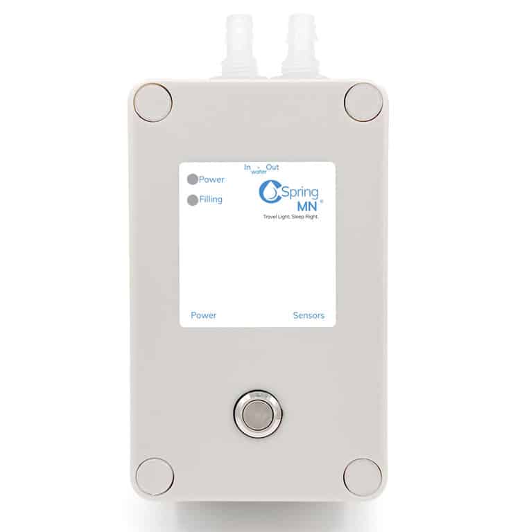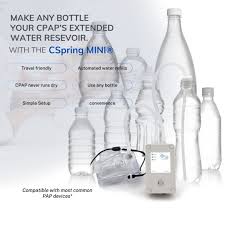 The CSpring Mini Portable CPAP Water Replenishment System is a compact device that automatically keeps your CPAP humidifier filled during travel. It connects to a standard water bottle, turning it into a lightweight reservoir that supplies water to your CPAP chamber throughout the night.